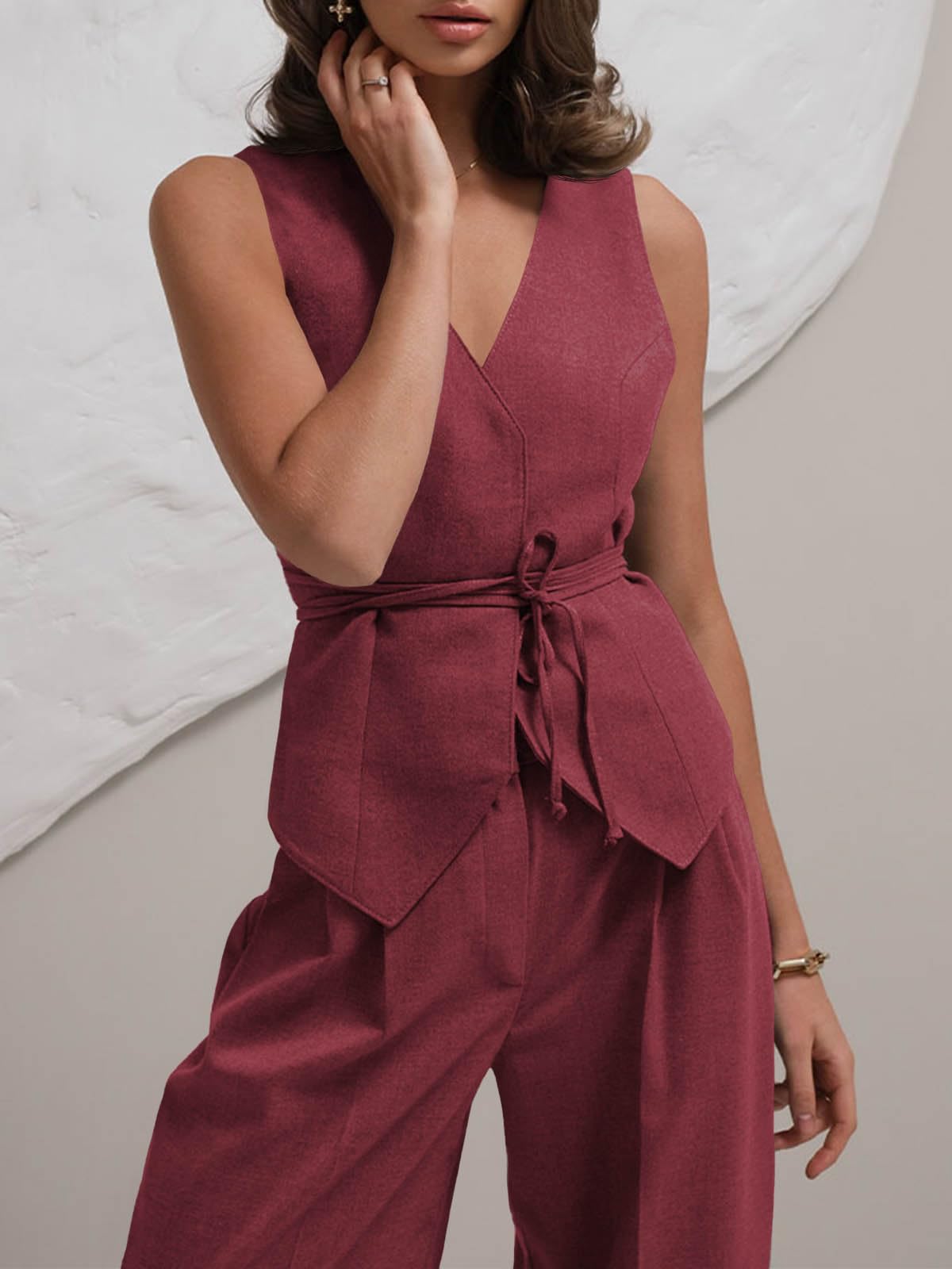 Descubre la elegancia y la versatilidad con el Conjunto de dos piezas Cicy Bell en un profundo y favorecedor color burdeos. Este traje informal de negocios está diseñado para la mujer que busca destacar con un toque de sofisticación y comodidad. El Blazer con cuello en V realza la figura, mientras que el detalle del lazo en la cintura define y estiliza. El Chaleco a juego añade una capa adicional de elegancia y permite múltiples opciones de estilo. Los Pantalones de traje de pierna ancha ofrecen un look moderno y profesional, garantizando libertad de movimiento y un ajuste cómodo durante todo el día.