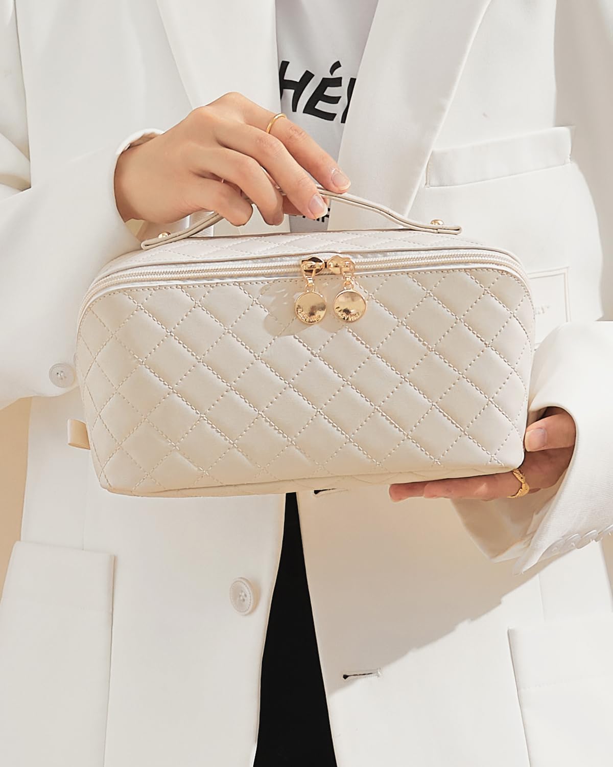 Este neceser EACHY no solo es funcional, sino también elegante y portátil. Su tamaño mediano ofrece un amplio espacio sin ser voluminoso, y su asa resistente facilita su transporte. Y a sea para una escapada de fin de semana, un viaje de negocios o simplemente para mantener tu tocador ordenado, este neceser se convertirá en tu compañero indispensable. Su diseño en color beige neutro y cómodo lo convierte en un regalo perfecto para cualquier mujer que valore la organización y el estilo en sus accesorios de belleza.