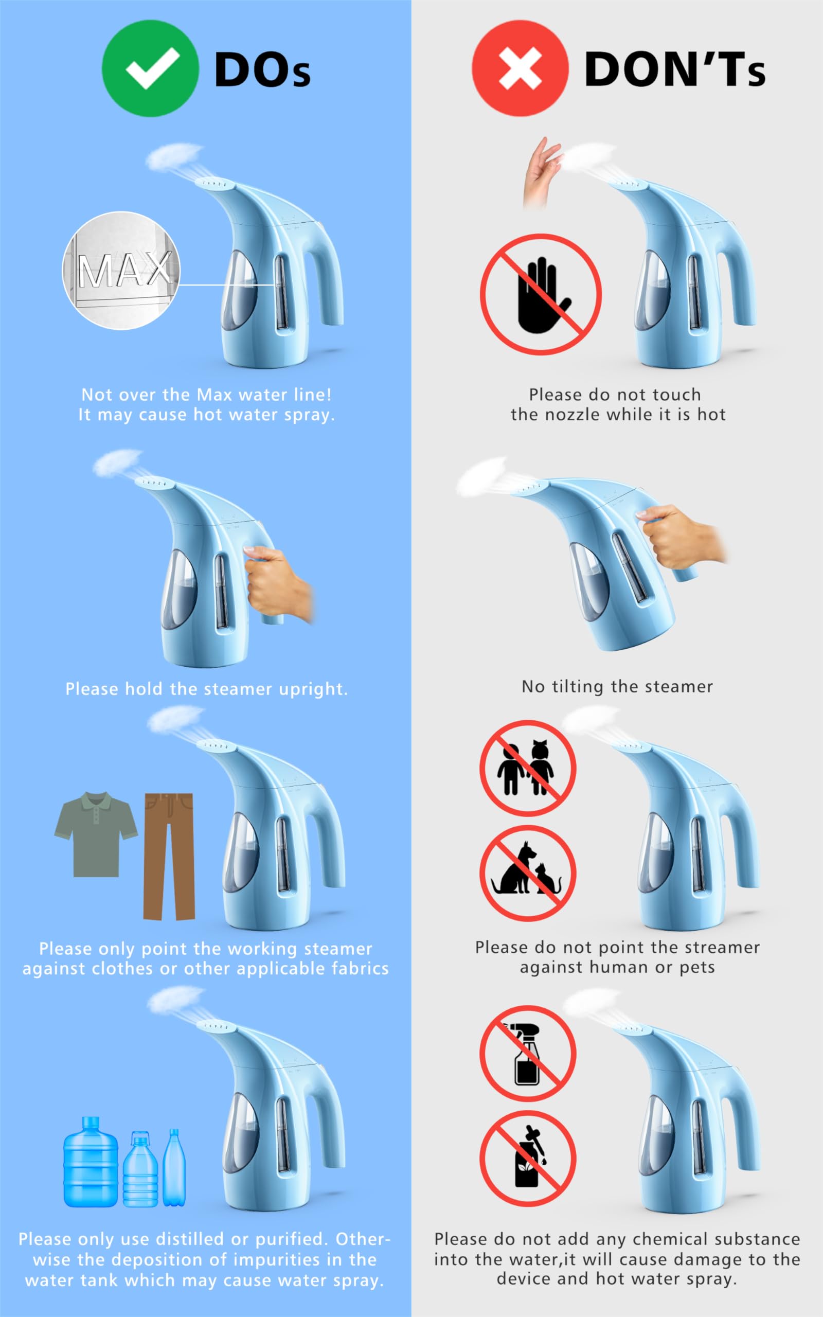 - Requisitos de alimentación : El vaporizador de prendas Hilife solo debe usarse en países y regiones con voltaje de 110-120 V, como EE. UU. UU., Canadá y Japón. Sin embargo, enchufarlo a una toma de corriente de 220-240 V oa una que no sea de 110-120 V dañará el producto.