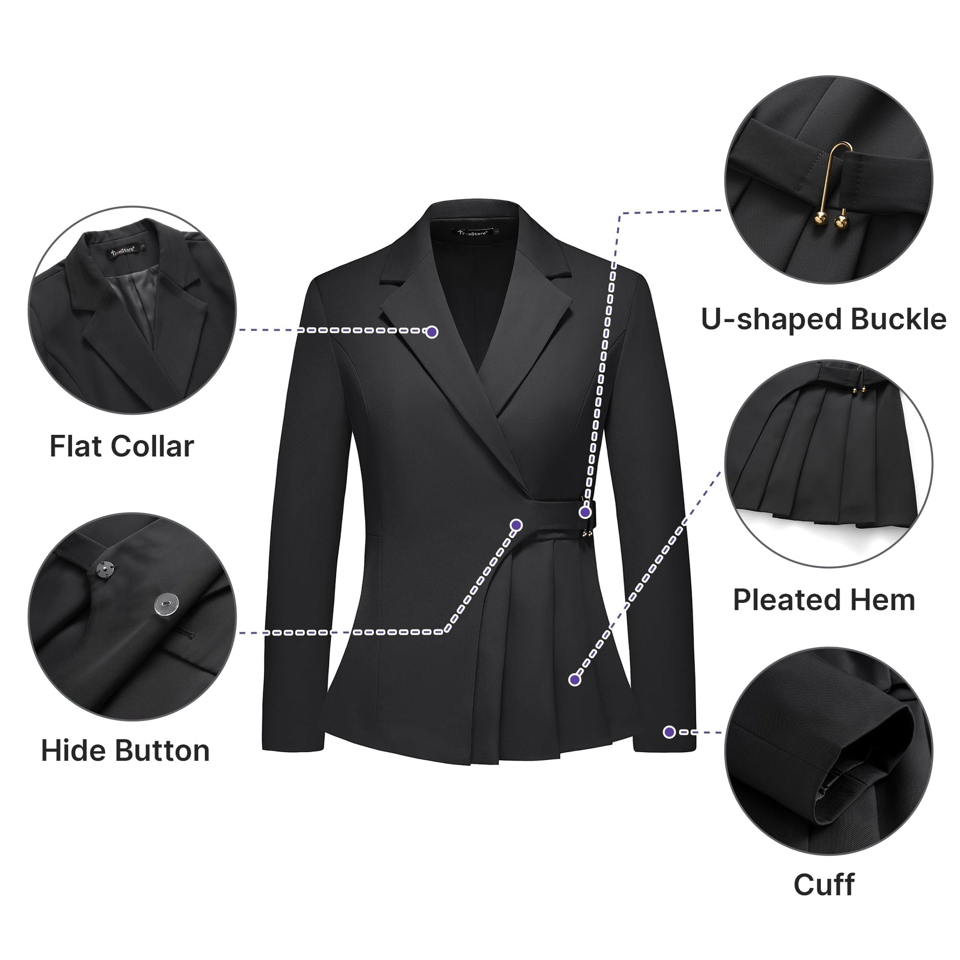 - Características de diseño únicas: Nuestra chaqueta lisa destaca por su diseño de manga larga, cuello plano y dobladillo irregular adornado con pliegues especiales. Estos detalles le dan al traje de mujer un aspecto distintivo, diferenciándolo de los trajes de negocios comunes.