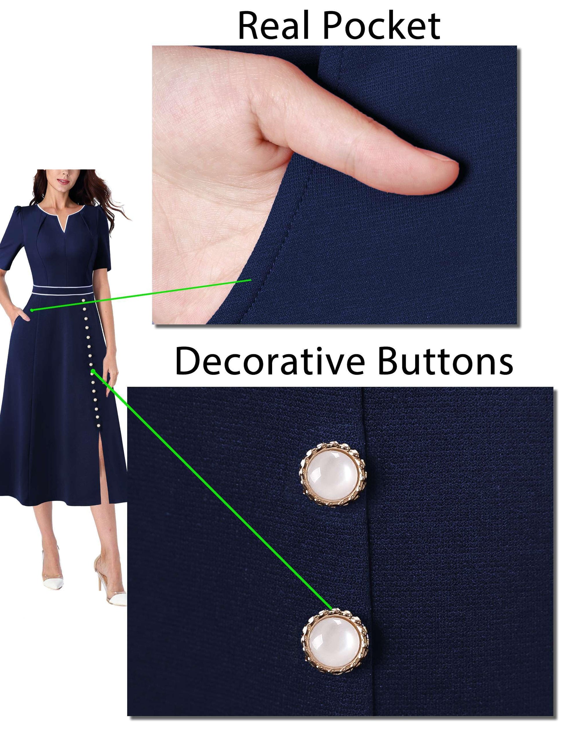 - Estilo: Escote plisado con muesca, hombros abullonados, abertura frontal con botones decorativos, manga corta, ribete en contraste, dos bolsillos prácticos, la silueta en forma de A ayuda a ocultar las imperfecciones del cuerpo, largo Midi, cremallera posterior oculta.